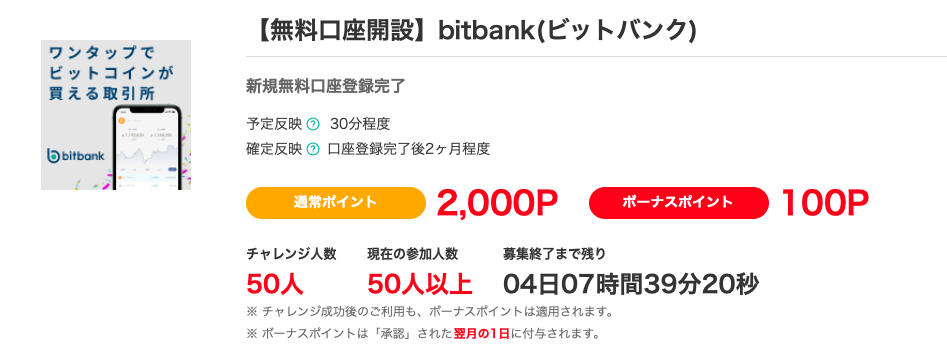 bitbank:2,000円+ボーナスポイント100円